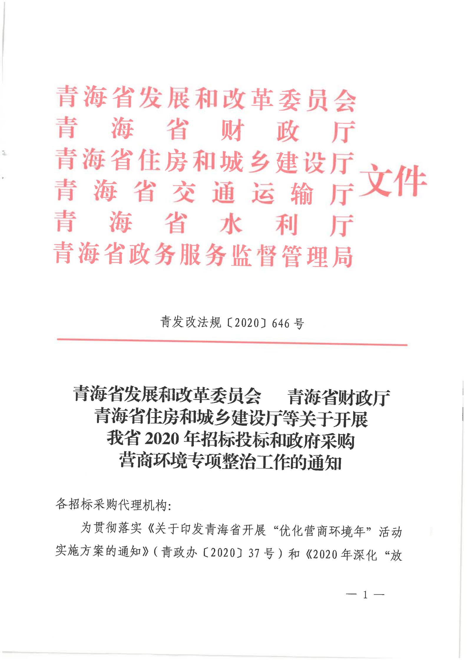 青海省發(fā)展和改革委員會青海省財政廳青海省住房和城鄉(xiāng)建設廳等關(guān)于開展我省2020年招標投標和政府采購營商環(huán)境專項整治工作的通知