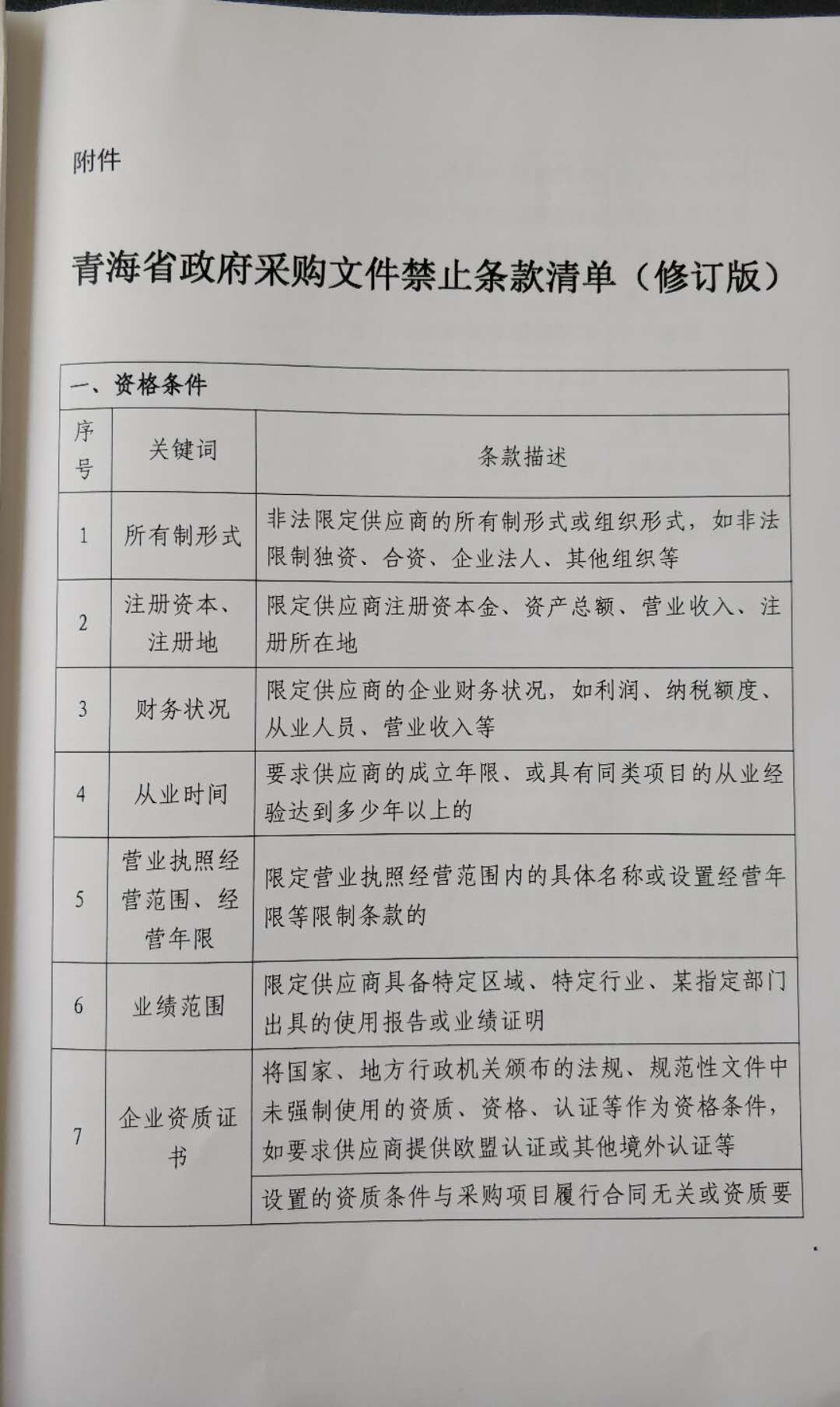 青海省財政廳關(guān)于印發(fā)《青海省政府采購文件禁止條款清單(修訂版)》的通知
