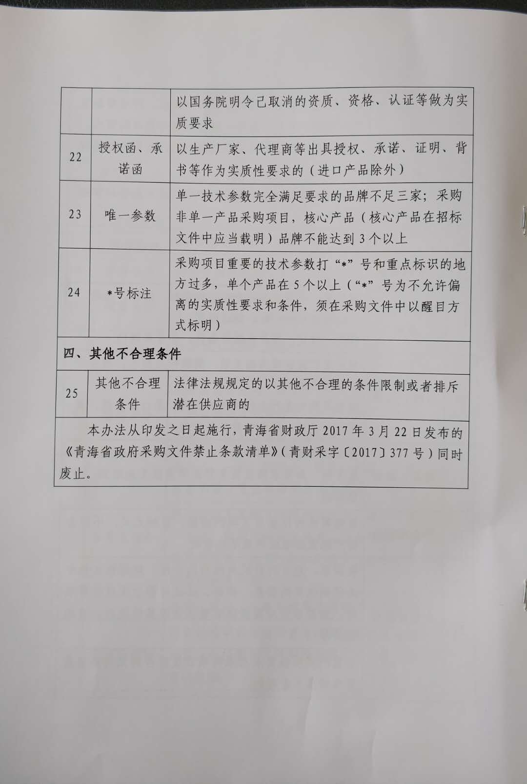 青海省財政廳關于印發(fā)《青海省政府采購文件禁止條款清單(修訂版)》的通知